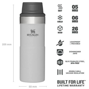 Stanley Trigger Action termos bardak, çoğu kahve makinesinin altına ve çoğu bardak tutucusuna sığacak şekilde tasarlanmıştır, böylece günlük işe gidip gelirken yanınızda olabilir. Çift cidarlı vakum yalıtımı, en sevdiğiniz çay, kahve veya diğer sıcak içeceklerinizi 5 saat sıcak, 6 saat soğuk ve 26 saat buzlu tutar. Şehir içi ve açık hava maceralarınız için mükemmel bir arkadaştır.